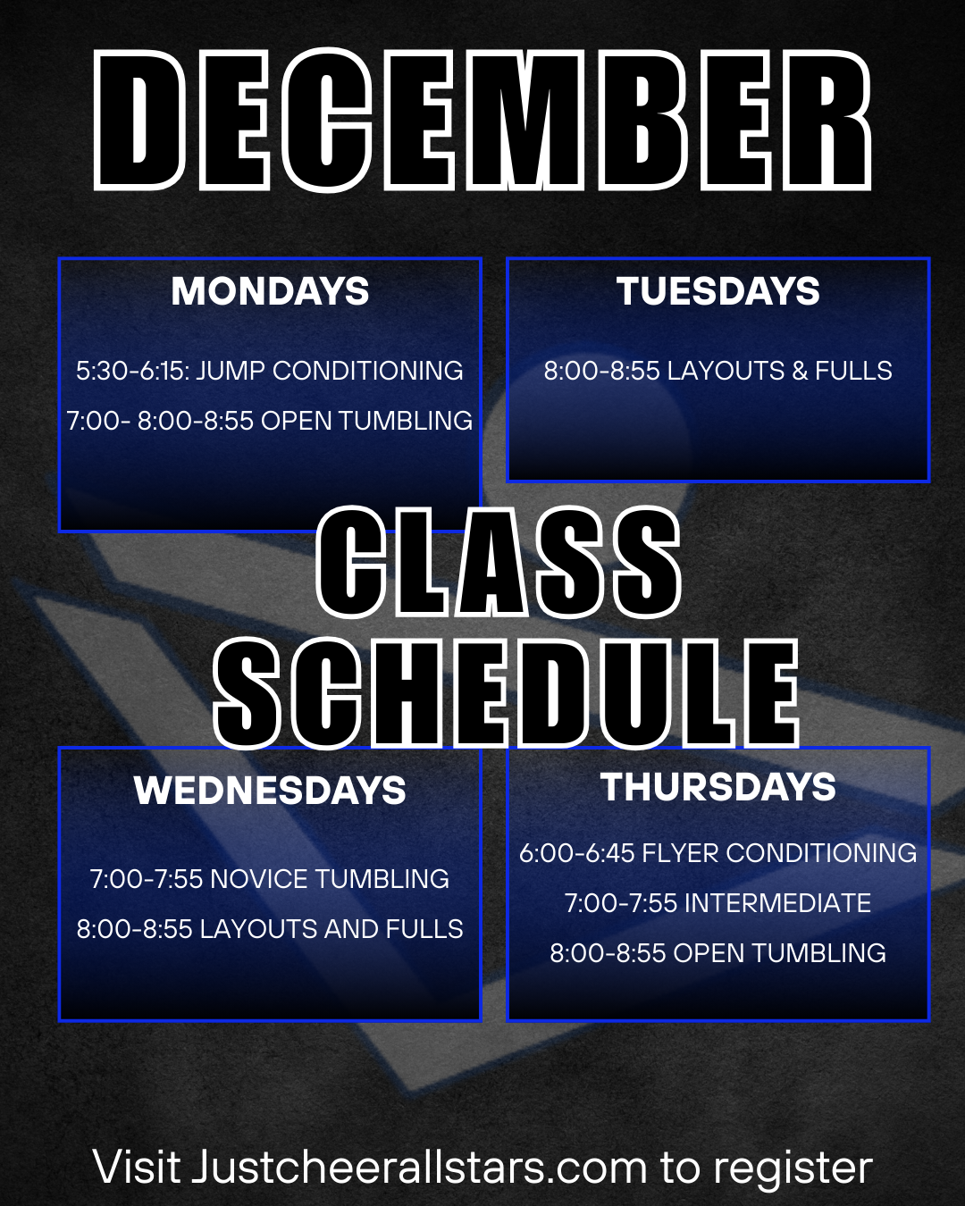 Can't make it to a specifically tailored class? Open tumbling is the perfect class offered for ALL SKILL LEVELS! Athletes will have the opportunity to use the equipment needed to gain and or improve upon their current skill level!
