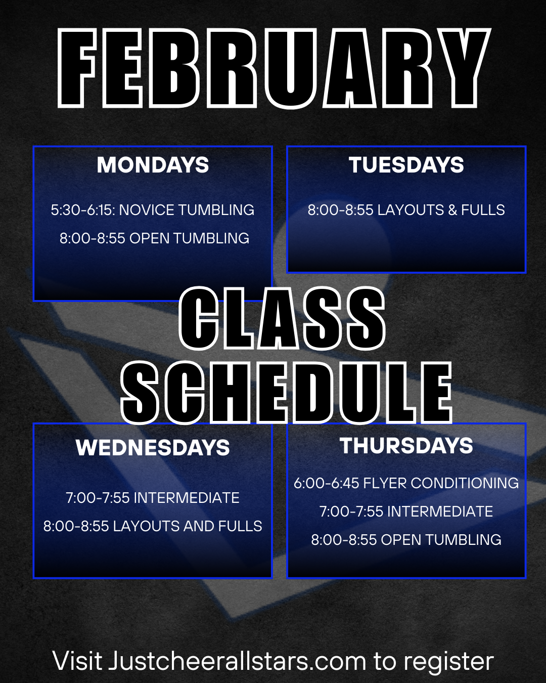 Are you currently a flyer, looking to hold a flyer position, or simply become more flexible? Our Flyer Flexibility class is a perfect class to achieve just that, FLEXIBILITY! During this class athletes will partake in a multitude of exercises that will strengthen and expand the muscles, improving on your flexibility range. This class takes place on the floor, flyers will NOT be lifted on a stunt group, but may be used on a stunt stand.