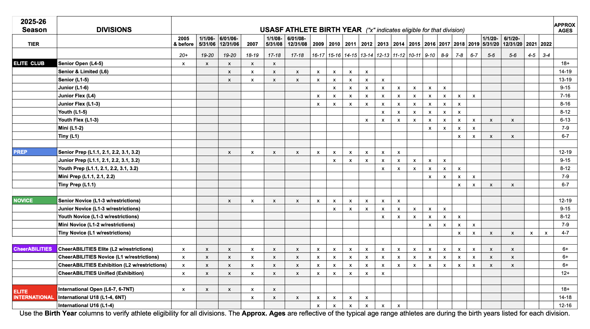 **Reminder: An Athlete qualifying for a higher age division does NOT guarantee placement in that division. At Just Cheer we take into account maturity, tumbling, stunting abilities, jumps, motions, choreography and overall attitude when placing athletes.. Our teams are carefully structured to not only benefit the athlete but their team as well.