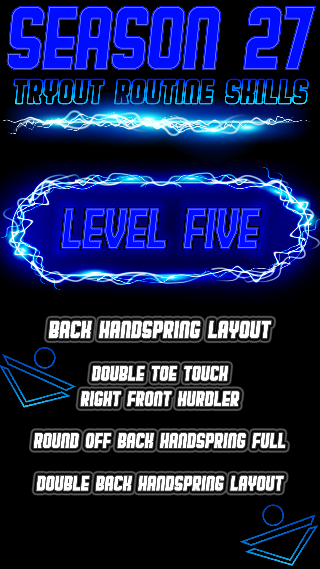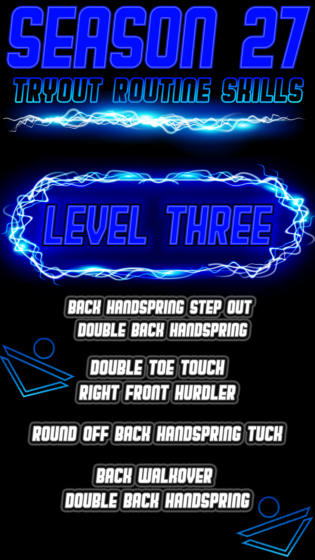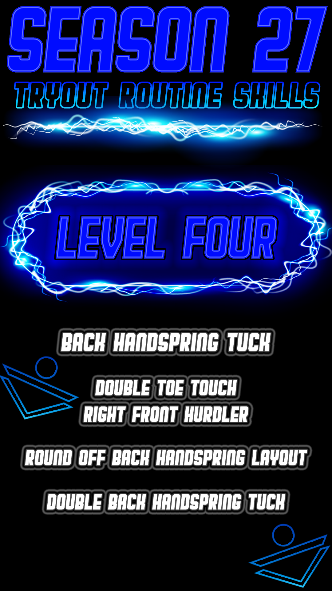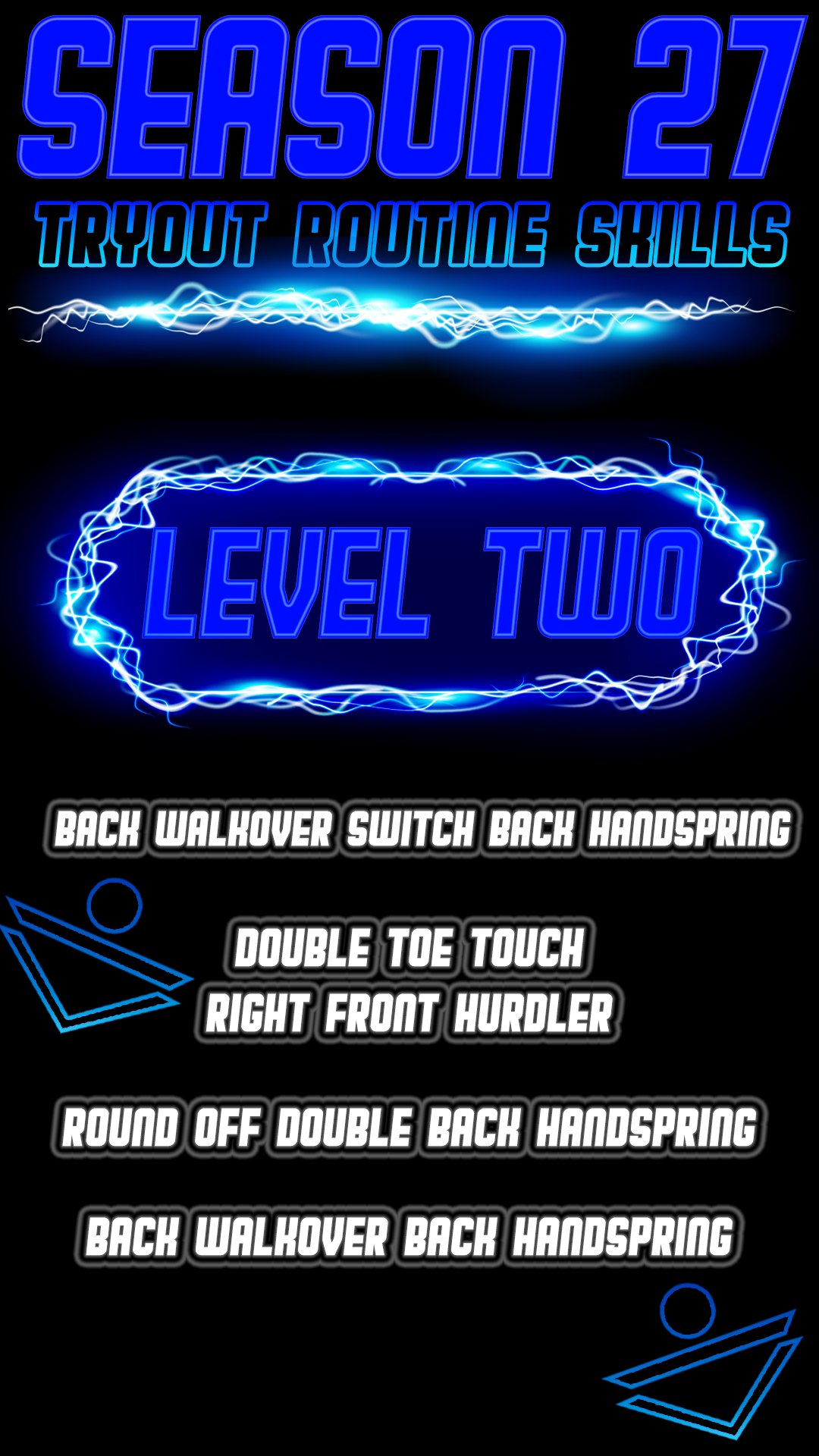 Any athlete that is registered for an evaluation time, MUST perform a Level Skill Routine pertaining to their current tumbling abilities. If you do NOT possess ALL of the skills portrayed within the level video, you may NOT try out for that level. When selecting teams, based on the talent pool of guaranteed spots, we will invite additional athletes based on positions that may be available to help fulfill a team. This will be based on: additional skills, prior experience, and performance abilities. Evaluation videos can be found on our youtube channel, or by visiting the links below.