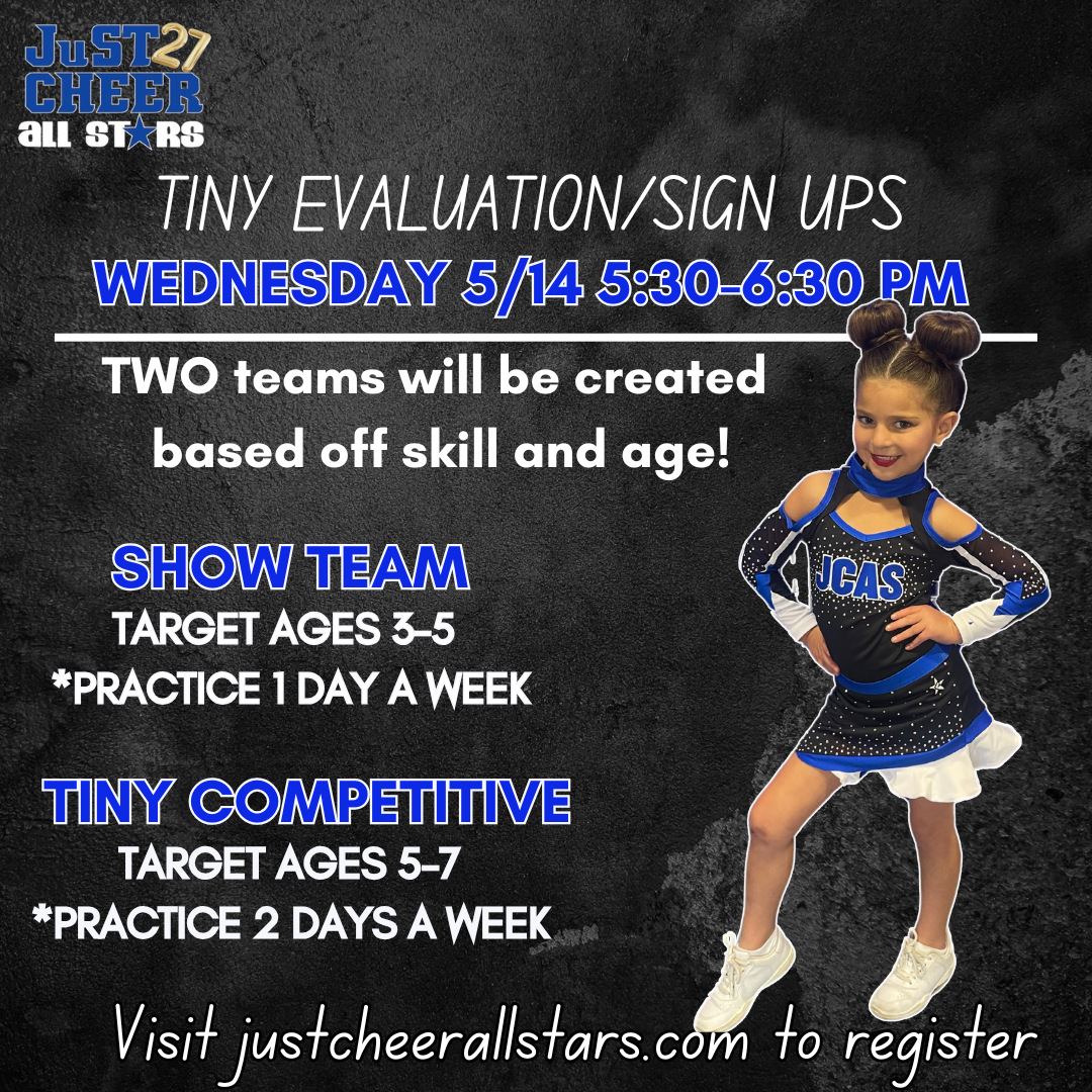 Tiny Showcase Team: This is an entry level team for beginner athletes ages 3-4 years old. This team will NOT be competitive, and showcase at about 2-3 Showcasing events such as our Season 27 Showcase, JCAS Hosted Competition, Post Season Showcase etc. No skill requirements are needed. This program is perfect for younger aged athletes looking to enter into competitive cheerleading.